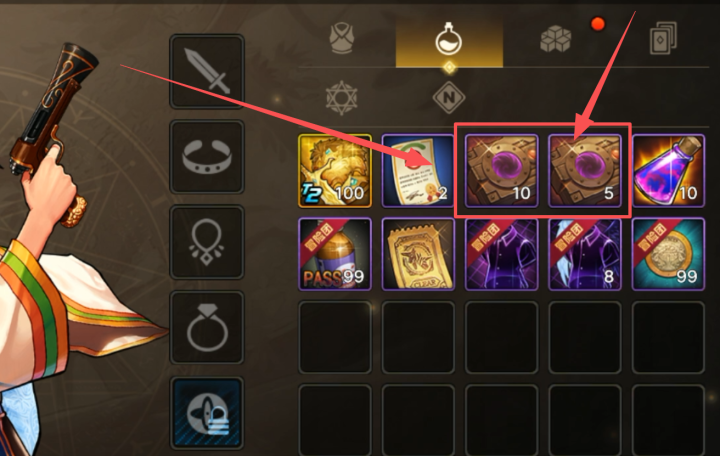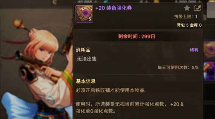 之后我们点击右下角的背包,在第2页,就会发现两个这个图形的东西,右下角标注了10和5,我们点上去看它的具体描述:包含了10个+15的强化券和5个+20的强化券。